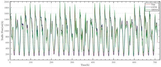 - The LSTM model is able to perform the forecasting task better than in the traffic forecasting module. The LSTM model used in the forecasting module is transformed into a sliding window model for traffic forecasting to predict the effect of the next period, which greatly improves the forecasting effect. This also highlights the accuracy of the prediction results compared to the traditional time-series prediction model ARIMA.