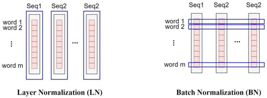 LN is used before every block and residual connections after every block in a Transformer to scale the features for each sample of a sequence. LN helps to speed up and stabilize the learning process. Additionally, LN [66] is proven to yield significantly better performance than Batch Normalization (BN) in Transformers, and BN is often used in CNNs to scale an entire feature map. For a batch of sentences in Transformers in NLP, BN scales over the words at the same position of each sentence, and LN scales over all the words in each sentence, as shown in Figure 2. Obviously, scaling the words at the same position in different sentences does not follow the design of sequence models, whereas LN satisfies the requirements of Transformers.
