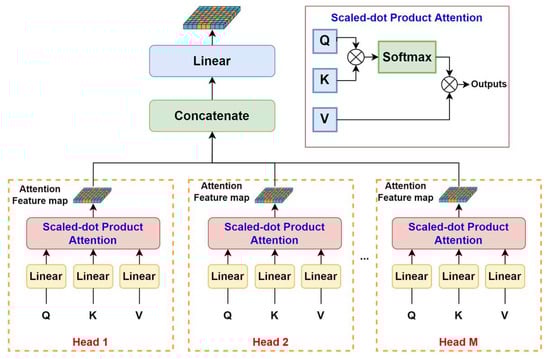 where dk is the dimension of both Q and K, and the Softmax function scales the weights in the range [0, 1] and makes the weights equal to one. The multi-head self-attention links multiple convolution kernels in CNNs to generate multiple feature maps. The more self-attention feature maps there are, the better the performance models could achieve. The multi-head self-attention is computed as: