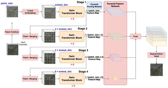 The proposed Transformer-based network for building extraction has an encoder-decoder architecture, as shown in Figure 4. A novel Swin Transformer is utilized as the encoder to extract the multi-scale-self-attention-based features of the VHR images. Based on the multi-scale features, we further introduce a Pyramid Pooling Module (PPM) [67] in the decoder to add global context to a VHR image; then, we use a Feature Pyramid Network (FPN) [68] in the decoder to fuse the multiple different scales of feature maps. All of these fused feature maps are upsampled into the original resolution of the VHR image via a segmentation head. The segmentation head projects the feature maps onto the pixel space to obtain pixel-by-pixel coverage of the building footprints.