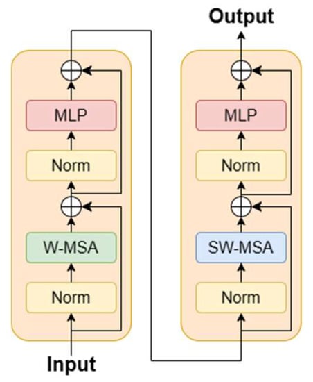 Swin Transformer blocks [37] are kernels in the Transformer-based building extraction network which implement the self-attention mechanism in an efficient way. Swin Transformer blocks are often stacked to capture deeper and more advanced features, as CNN blocks do. Inside a Swin Transformer block, a shifted window is introduced to compute both local and global self-attention. The shifted windows are non-overlapping windows that partition the VHR images on the top of image patches. To reduce quadratic complexity in computing self-attention, two successive Swin Transformer blocks can achieve self-attention computation with less complexity, as shown in Figure 5. The first Swin Transformer block contains a window-based multi-head attention (W-MSA) module which computes the self-attention within the window, and the second Swin Transformer block contains a shifted-window-based multi-head attention (SW-MSA) module, which computes self-attention across the windows by alternating between two partitioning configurationsW in consecutive Swin Transformer blocks. Therefore, two successive Swin Transformer blocks can compute the self-attention computation over the whole VHR image, and the computation takes less time.