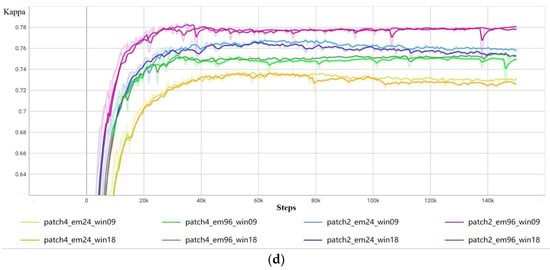 Figure 6 shows the accuracy variation curve on the validation samples during training. It demonstrates that the networks with the 2 × 2 pixels image patches and 96-dimensional embeddings (i.e., ‘patch2_em96_win09’ and ‘patch2_em96_win18’) achieved the highest score for all metrics. Figure 5 also demonstrates that when the patch size and the dimension of the embeddings of the build footprint extraction networks were the same, the varying curves of OA, mIoU, F1-score, and Kappa were very similar, which indicates that the window size of the network has little impact on the accuracy of the building footprint extraction.