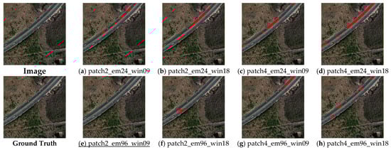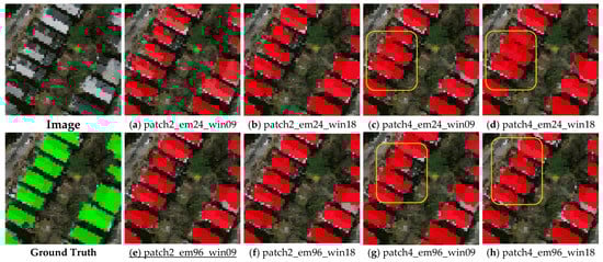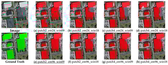 Non-building misclassification. In this study, the main non-building objects misclassified as building footprints are roads. Figure 9 shows an example of roads being misclassified as building footprints. It can be seen that the ‘patch2_em96_win09’ experiment group (i.e., Figure 9a) achieved the best performance, and a few pixels of roads were misclassified as building footprints. The ‘patch2_em96_win09’ experiment group, which was only different in terms of window size, only misclassified a few pixels of roads. Figure 6 also demonstrates the models with 24-dim embeddings (i.e., Figure 9a–d) misclassified roads more seriously than the models with 96-dim embeddings (i.e., Figure 9e–h), especially for the models with patch sizes of 4 × 4 pixels (i.e., Figure 9c,d).