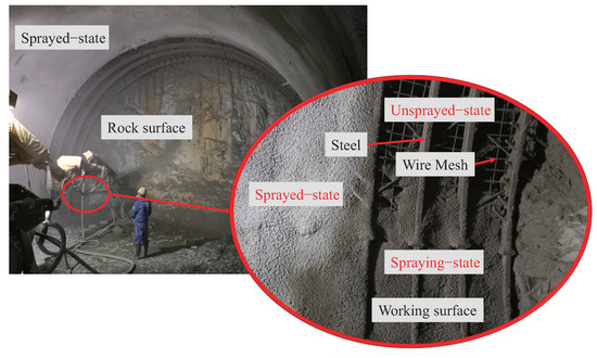 Current construction method and classification of wet shotcrete states. The red large circle indicates a magnification of the details in the small circle.