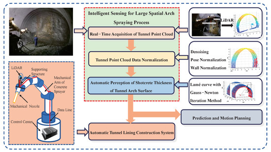 The solution of automatic tunnel lining construction system. The red box represents the components of "Intelligent Sensing for Large Spatial Arch Spraying Process", which include real-time point cloud acquisition, point cloud normalization, and intelligent perception for the steel arch. The arrows indicate the specific contents included in each component.
