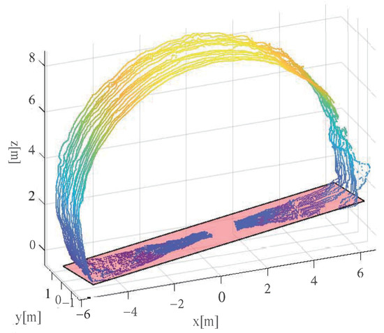 To extract the plane of the point cloud data, the MSAC algorithm is utilized to obtain the plane equation, as shown in Equation (5). In this algorithm, a fixed penalty is given for out-of-model points, while for in-model points, the fitting effect of the model is considered to establish the most accurate model. Figure 5 shows the fitting result, which demonstrates that the extracted plane points correspond well with the road surface of the tunnel.