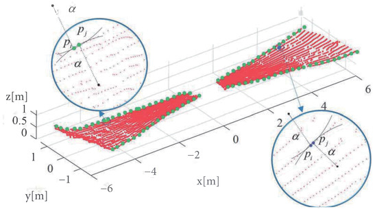 where and are the parameters of a curve, and the RANSAC (RANdom SAmple Consensus) algorithm [34,35] is used to estimate the parameters of the model. Then, the inclination angle of the point cloud in the plane can be expressed by Equation (8).