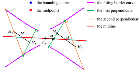 To obtain the midline of the plane, we first use the uniform sampling method to obtain 50 sampling point sets on each boundary. For each sampling point, we record the normal line perpendicular to the boundary and the intersection point set with the opposite boundary. Then, we recalculate the intersection of the normal line at the intersection point on the boundary with the original boundary and record the intersection point set. Next, we take the midpoint of each line segment between the two intersection points and then calculate the midpoint of the two midpoints. The resulting set of midpoints is used to fit the midline using Equation (7). The entire process is illustrated in Figure 7.