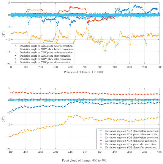Comparison of deviation angle before and after correction. The x-axis represents different point cloud frames, while the y-axis represents the inclination angle.