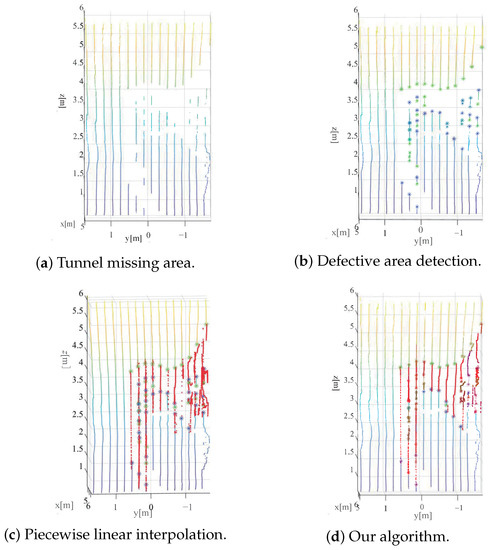 In order to compensate for missing data in the tunnel wall, this paper presents an adaptive point cloud compensation algorithm based on an interpolation model. The algorithm consists of two main parts: automatic detection and automatic interpolation. During data collection, construction equipment and workers may obstruct the tunnel wall, leading to incomplete point cloud data. In order to address this issue, the proposed algorithm aims to automatically detect the missing areas of the tunnel wall point cloud and interpolate the missing data segments.
