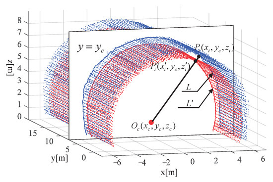 The cross-section of a tunnel is typically designed as an ellipse [36]. There are two types of algorithms to obtain an ellipse equation: non-iterative and iterative algorithms. Examples of non-iterative algorithms include the Lagrange multiplier-based method proposed in [37]. Iterative algorithms include the Gauss–Newton algorithm-based method introduced in [38,39]. However, due to the complex tunnel environment during the construction phase, the collected point cloud data are not suitable for non-iterative algorithms. Therefore, in this study, Taylor series expansion was used to approximate the nonlinear regression model and improve the regression coefficients by multiple iterations and corrections until the minimum residual sum of squares was achieved. This method is referred to as the Gauss–Newton iteration method.