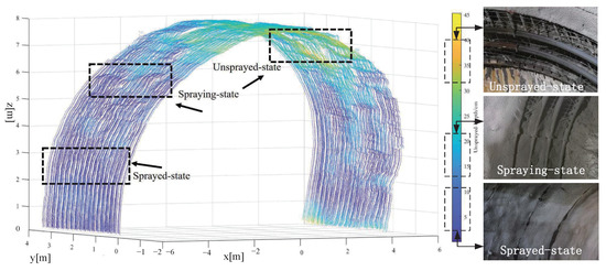 In the automatic tunnel lining construction system, the wet shotcrete process of the tunnel arch is divided into three states: the unsprayed-state, the spraying-state, and the sprayed-state [27,28]. The unsprayed-state is the state in which the shotcrete has not yet been sprayed, the spraying-state is the state in which the shotcrete is being sprayed, and the sprayed-state is the state in which the shotcrete has been applied, as shown in Figure 1. LiDAR is used to collect tunnel point cloud data in these three states, which is then processed using denoising, correction, clustering, and compensation techniques to extract the tunnel arch points.