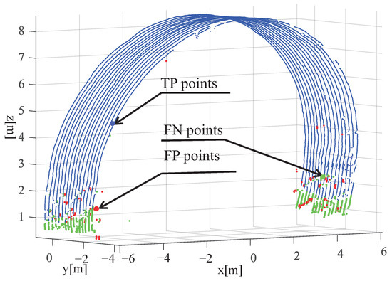 In Figure 15, the variables (True-Positive) marked in blue and (False-Positive) marked in red indicate the number of points that were labeled correctly and incorrectly as tunnel surface points, respectively. The variable (False-Negative) marked in green represents the number of points that were falsely labeled as non-tunnel surface points. To evaluate the performance of the model, the precision, recall, and F-score criteria used by Yang et al. [42,43] are adopted.