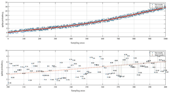 Comparison of the ideal unsprayed depth and the results obtained by our algorithm. The x-axis represents the sampling area, the y-axis represents the unsprayed depth, and the point marked with a star (✩) represents the ideal unsprayed depth. The point marked with an asterisk (*) represents the result obtained by our algorithm, and the number next to the point represents the absolute error between the unsprayed depth obtained by the proposed algorithm and the ideal unsprayed depth.