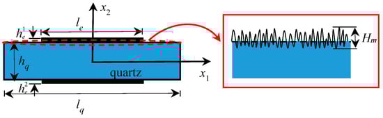 For the convenience of theoretical analysis, the surface roughness is usually treated as periodically distributed [36], e.g., cosine, triangular or rectangular function. However, many structure surfaces are randomly rough, with a large number of asperities, and the asperity height belongs to a Gauss distribution [37]. Zhang et al. [38] verified that the surface height with a Gauss distribution is closer to the real appearance of the crystal surface. Therefore, the Gauss distribution is utilized to describe the random surface in this paper. A quartz plate with surface roughness is considered, and the surface roughness is characterized by the peak height of asperities, Hm, as in Figure 1. The plate thickness is hq, and and are the thickness values of upper and bottom electrodes, respectively. The quartz plate length is lq, and the electrode length is represented by le, respectively. The aim of this contribution is to investigate the influence of surface roughness on the coupling vibration under different temperature environments.