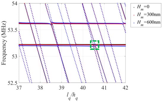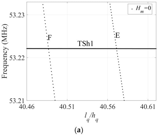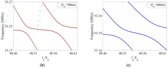 To analyze the impact of surface roughness on mode coupling, a zoomed-in image of the frequency spectra in the green region in Figure 2 is presented in Figure 3. In Figure 3a, the TSh1 mode intersects the E and F modes, but there is no coupling when Hm = 0. However, as shown in Figure 3b,c, when the crystal plate surface is rough, the flat portions are interrupted by oblique portions, resulting in strong coupling between the TSh1 mode and E or F mode. The comparison reveals that crystal plate surface roughness results in mode coupling, with greater Hm causing stronger coupling. Because of surface roughness, the crystal plate is not symmetric along the x2 direction anymore, and then the E or F mode easily couple with the TSh1 mode.