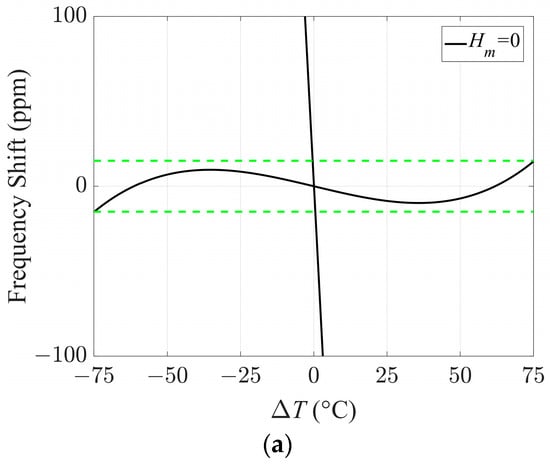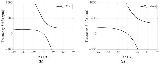 The frequency-temperature curves: (a) Hm = 0 (the green dashes in Figure 4a represent the frequency tolerance range); (b) Hm = 300 nm; (c) Hm = 600 nm.