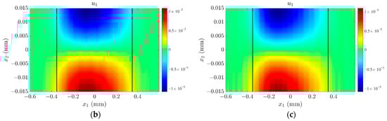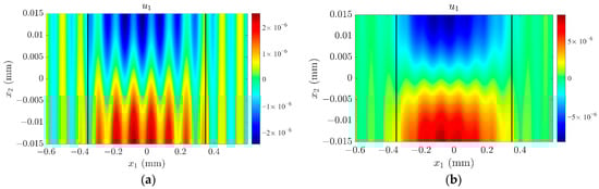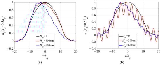 To better illustrate the energy distributions of the sensor, Figure 9a,b depict the distributions of vibration energy in the middle region of the quartz crystal plate, extending to both boundaries. Specifically, Figure 9a,b display the distribution of the displacement component u1 along the x1 direction at x2 = 0.5 hq for two scenarios: no mode coupling of the quartz plate (lq/hq = 40) in Figure 9a and strong mode coupling of the quartz plate (lq/hq = 40.7) in Figure 9b, respectively. These figures indicate that crystal surface roughness impacts the energy position in the electrode region and accelerates the decay of vibration amplitude in the middle region of the quartz crystal plate. Moreover, the amplitude variation of u1 in Figure 9b is more complex, which is attributable to the crystal surface roughness. Therefore, to avoid frequency shifts, the length/thickness ratio of the resonator should be altered by grinding or the surface roughness should be improved by polishing.