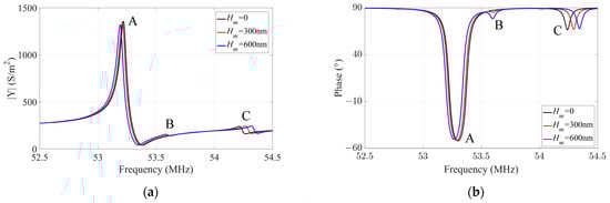 In this section, the influence of surface roughness on the electrical response of a quartz crystal plate undergoing forced vibration is examined. A pair of driving voltages of ±3 V is applied on the top and bottom surfaces of the crystal plate, enabling the acquisition of the admittance response at various frequencies. Taking lq/hq = 40 as a typical case, the admittance response and corresponding phase distribution are calculated via Equation (11), and shown in Figure 6a,b, respectively.