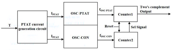 This article presents an on-chip temperature sensor with a temperature-frequency conversion mode, which can reduce the impact of some interference variables such as power supply voltage, device, and process deviations to a certain extent through a twin-temperature sensing process architecture with the same structure []. Based on the time domain, CMOS temperature sensors have a low accuracy and are susceptible to power supply voltage disturbances if external modules such as Low-dropout regulators (LDO) are not used due to their structure. Therefore, this architecture is one of the solutions to address the poor PV (Process-Voltage) characteristics of time-domain CMOS temperature sensors. The temperature sensor can achieve a temperature measurement range of 0–100 °C and, after a two-point calibration, the inaccuracy is +0.65 °C/−0.49 °C, the resolution is 0.003 °C, the area is 0.059 mm2, and the power consumption is 32.9 μW.