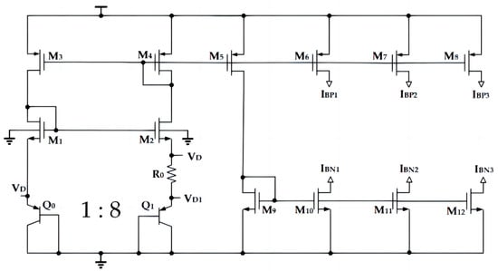 Here, q represents the electronic charge, k is the Boltzmann constant, IC and IS are, respectively, the collector and saturation currents of the PNP, T is the absolute temperature, and n represents the number of transistors in parallel with . In order to achieve circuit matching, the circuit in this paper was designed with n = 8.