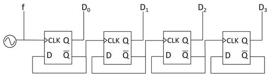 The square wave signals generated by OSC-PTAT and OSC-CON are, respectively, input into cascaded D flip-flops shown in Figure 5 as the clock signal of the first D flip-flop. When a clock pulse arrives, the first D flip-flop sends the D input data to the Q output and the inverted data of Q to the Q’ output, which serves as the clock signal of the next stage D flip-flop. The same process is repeated for the next clock pulse, but with the input data already inverted. This results in the Q output changing its state every two clock pulses, achieving a halving of the frequency. By cascading D flip-flops, a frequency divider circuit is implemented which converts the signal frequency into a binary counting function. The counting value of OSC-CON is taken as a reference to observe the counting value of OSC-PTAT at this time.