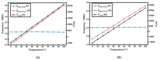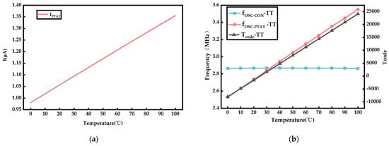 The circuit design was implemented using the SMIC 180 nm mixed signal CMOS technology in Cadence 6.17, and the circuit was simulated using the spectre tool. Under the TT process corner, Figure 6a shows that the PTAT current output of the temperature sensing circuit is proportional to the temperature ranging from 0 °C to 100 °C. Figure 6b shows that, as the temperature varies from 0 °C to 100 °C, the frequency of remains relatively constant, while the frequency of varies in direct proportion to the temperature. The output code is proportional to the temperature.