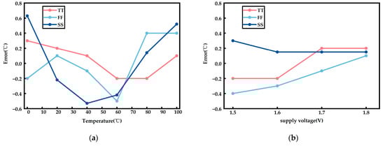 The temperature measurement error of the temperature sensor. (a) The temperature error curves of the temperature sensor under various corners. (b) At 40 °C, the temperature measurement error of the temperature sensor under various corners.