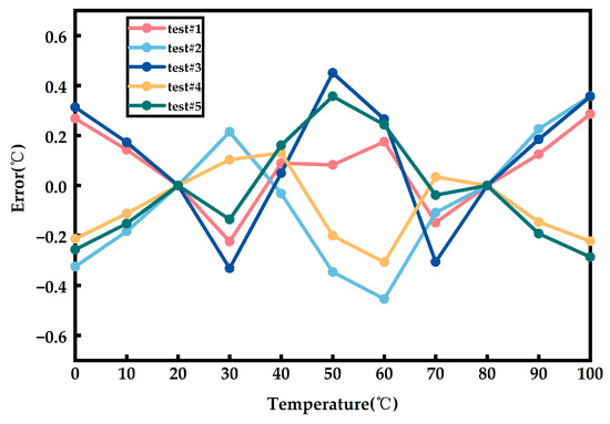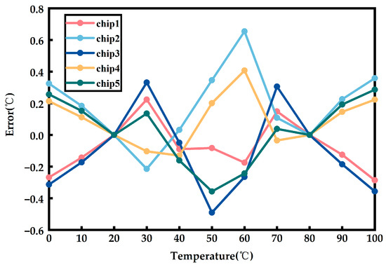 As shown in Figure 12, five temperature sensor chips were tested. The final output code is a function of temperature: . Then, the output signal amplitude under any two temperature points (, ) is determined, assuming that the temperature measurement error is 0 at these two points. This determines the coordinates of the two points, which are used to obtain the calibrated “ideal curve”. Finally, the temperature measurement error at each point can be obtained based on the definition of temperature measurement error. By performing two-point calibration, the temperature measurement error is within +0.65 °C/−0.49 °C.