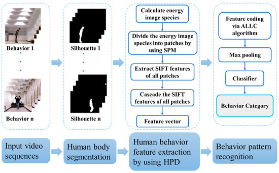 Overall, many studies have been done on dictionary-learning-based approaches to human behavior recognition, and the present work adds other unique architectures involving energy images, the hierarchical patches descriptor (HPD), and the approximate locality-constrained linear coding (ALLC) algorithm. Experimental results and comparative analyses using the Weizmann and DHA datasets were demonstrated to be superior to some state-of-the-art approaches. In future work, to improve the robustness, we will consider constructing a human behavior model by fusing the RGB and depth information. In addition, in the case of large-scale data, deep-learning-based approaches need to be considered, such as multi-modality-based improved CNN and RNN.