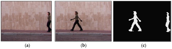 Human body segmentation is the basis of behavior recognition, and it aims to extract the body silhouette from an image sequence. In this paper, the background difference method [35] is employed to extract the human body silhouette. This method assumes that the background changes slowly or tends to be stationary, but in reality, there often exist factors such as light changes, background disturbances, and camera jitter. Therefore, it is necessary to model the background. However, if the initial frame used for modeling contains a moving target, the previous foreground target will be taken as background in the foreground determination step, which will lead to the so-called ghost area appearing in the pedestrian detection results of the current frame, as shown in Figure 2.