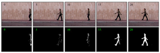 Figure 3 shows the pedestrian detection results in the 0–20th frame (every 5 frames) of a walking video by background-updating strategy. In Figure 3, we can observe that those ghost areas remain in the contours of target detection in subsequent frames since the initial frame contains a moving target. However, the ghost area residues gradually disappear with the updating strategy. By the 20th frame, the outline of the human body has become very clear. Therefore, VIBE can utilize the spatial propagation advantages of the pixels to gradually diffuse the background model outward and quickly eliminate the ghost areas.