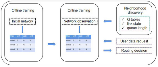 As shown in Figure 2, the system framework consists of three parts: Neighbor Node Discovery, Offline Training, and Online Training. In multi-agent reinforcement learning, the learning process of the agent needs the information of the neighboring agents, which includes Q-table, connection status, and available resources. Therefore, we develop the neighborhood discovery part for agents to share information. During the offline training phase, we perform the initial training of the agents in a ground-based network environment. By randomly generating packets, the agents act by observing the state of the packets and the state of the neighboring nodes. To avoid local optimal solutions, we use the -greedy strategy to explore a larger unknown space. Static network training results are not fully suitable for dynamic LEO satellite networks, so online training is required to fine-tune the Q-table. Agents make routing decisions for satellite networks based on the pre-trained model and update the Q-table with the feedback results. It is important to note that the -greedy strategy is not used at this stage, as we only need to fine-tune the Q-table. The advantage of using the pre-trained method is that it saves onboard resources and improves the performance of the initial phase of the algorithm.