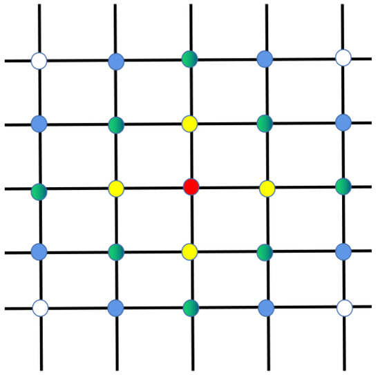 As shown in Figure 3, there are five orbits, each with five satellites. Each satellite is represented by a dot with a different color. The red node satellite transmits a message outwards, and the first to receive that message are the yellow nodes around it. The yellow node then passes the message to the green node, and the white node does not receive the message until the fourth round of message dissemination. This indicates that the message transmission in the satellite network is linear. In the traditional Q-routing algorithm, the agent receives the Q-table and link state information feedback from the neighbor nodes when and only when it sends a packet to its neighbor nodes. Then, the node updates its Q-table, which is a learning process. This paper proposes a method named empty packet convergence method to accelerate the perception of the network state by agents. Neighboring nodes do not only send status information after receiving a packet, but also broadcast its message by period t. The traditional learning process only updates a certain item of the two-dimensional Q-table at a time, while the empty packet convergence method updates the entire content of a node’s action space at a time. The smaller the t, the more often agents perceive the network. Therefore, we designed t to be inversely proportional to the node traffic density; the higher the traffic density, the smaller the t, and the faster agents perceive the network. This ensures faster awareness of the state of the network without increasing the network overhead too much.
