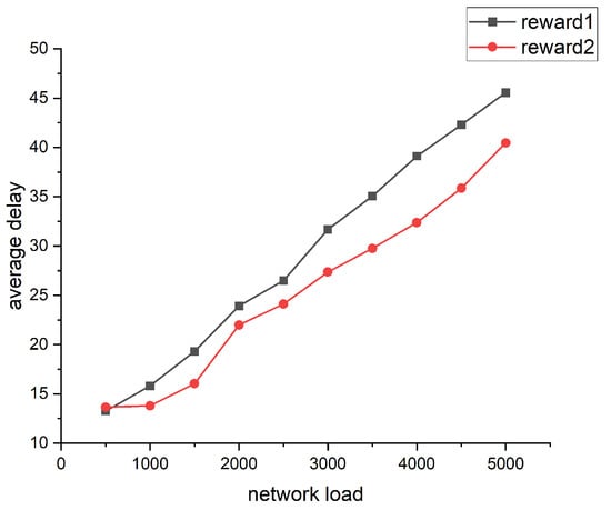 In this section, we present the simulation results of the FRL–SR algorithm. The experiment was mainly divided into two parts: First, we simulated different reward functions in reinforcement learning and found out which one could minimize the delay for our subsequent experiments. Then, we compared the performance differences between the FRL–SR algorithm proposed in this paper and the traditional Dijkstra algorithm, both running in the same network environment and with the same user data requirements. We compared these two algorithms in terms of average delay, packet arriving ratio, and network load balance, and explained the reasons for their performance differences. To make the experimental results more accurate, we repeated all the experiments three times and took the average of the results as the final result.