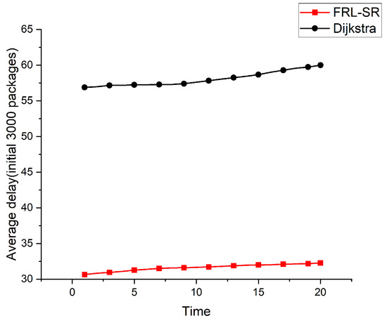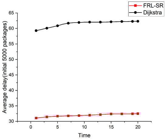 Both Figure 5 and Figure 6 show the relationship between the average delay and time in operation for the FRL–SR algorithm and the Dijkstra algorithm. To better demonstrate the actual effect of the algorithm, we took the study time after the network was relatively stable, rather than when the system was first put into operation. The initial number of packages in Figure 5 is 3000, and the initial number of packages in Figure 6 is 5000. We can see that the FRL–SR algorithm showed consistent performance in environments with different initial packet counts.