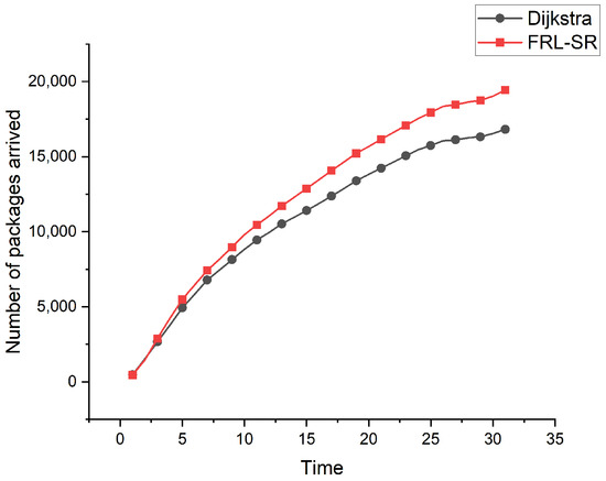 The relationship between cumulative number of packets and time is shown in Figure 7. We can see that, over time, the advantages of the FRL–SR algorithm over the Dijkstra algorithm gradually become apparent. Each satellite node has limited resources, so the communication capacity of the whole network is also limited. The FRL–SR algorithm considers the resource utilization of satellite nodes as an optimization objective. When a satellite node selects the next hop, it takes the queue length of neighboring nodes as a consideration parameter and forwards the packets to the satellite with sufficient communication resources first, which improves the resource utilization of the network and forwards more packets per unit time.