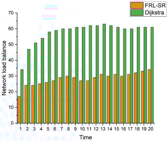 Figure 8 shows a comparison of the load balance of nodes in the network. We use the population standard deviation to express the load balance of the network, as shown in Equation (9), where M is the mean of the data and n is the total number of nodes in the network, which is a commonly used parameter to describe the degree of discreteness of the system. By observing the simulation results, we can observe that, under the same user request conditions, the FRL–SR algorithm has a better load balancing effect than the Dijkstra algorithm. The former can make full use of the resources of each node for routing, while the Dijkstra algorithm is more likely to cause network congestion.