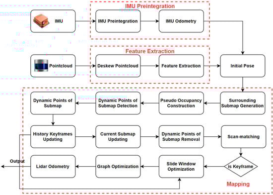 In addition to optimization-based LIO systems, filter-based LIO systems have emerged in recent years. The error state Kalman filter is used in [23] to propose a filter-based method for LiDAR-inertial odometry that estimates the robot’s pose state. FAST-LIO [24] represents a new method to calculate the Kalman gain to accelerate the system. FAST-LIO2 [25] directly uses the original LiDAR points to perform scan-to-map registration and proposes the ikd-Tree structure to reduce the time consumption of map updates compared with the static k-d tree structure. Faster-LIO [26] has an iVox structure to organize voxels through a hash table and uses a LRU cache to realize map point addition and deletion, whose parallel accelerated version can achieve a performance that completely surpasses the performance of ikd-Tree. However, these existing SLAM systems are assumed to perform in a static environment. In fact, when an autonomous system navigates in realistic environments, the spatial structure will become more complex as more moving objects, such as moving people and cars, enter the environment. Therefore, for pose estimation and mapping, the online removal of dynamic objects is essential.