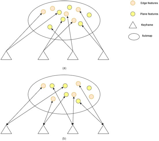 We do not initialize every LiDAR scan. When a current LiDAR scan is selected as a keyframe, we initialize the points of this keyframe. This is because the local map is composed of multiple keyframes. The state of feature points in a keyframe is what we are concerned with. The difference between a common point and an indexed point is shown in Figure 2. In Figure 2a, the local map consists of multiple keyframes composed of common points. In Figure 2b, because of the indexed point, we can know from which keyframe the points on the local map come. This part is used in Section 2.4.