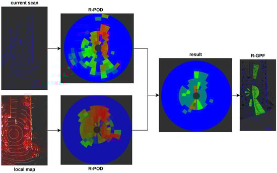 Overview of the online dynamic point detection method. First, we construct R-POD for the current frame and local map, respectively. Then, we compare the height difference in the pseudo occupancy in the scan R-POD and local map R-POD and obtain the dynamic pseudo occupancy of the local map. Last, we use the R-GPF method to obtain the ground plane, and the points above the ground are dynamic points.