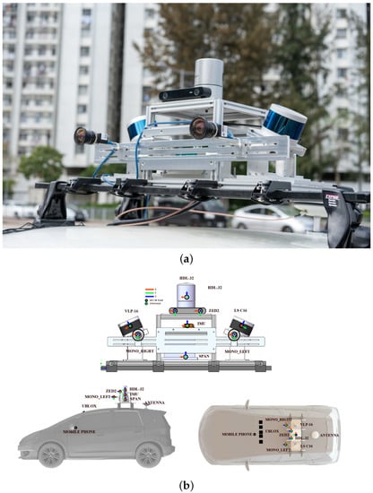The sensor suite of the UNHK [45] dataset. (a) is a view of the sensor kit in the car. (b) shows the distributions location of each sensors.