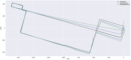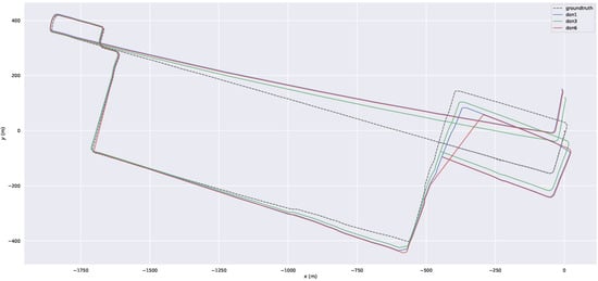 ULCA-MarktStreet was chosen for our analysis. Figure 5 shows the trajectories of different DONs with our system in ULCA-MarktStreet in an X–Y plot when the thresholds are 1, 3 and 6. This figure shows the total error for the three distinct thresholds. It can be seen that the trajectory corresponding to DON3 is closer to the ground truth because the DON3 system achieves a balance between dynamic point removal and static point retention.
