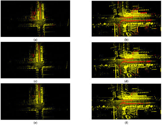 As shown in Figure 7, there are two kinds of red point sets in the figures. Red cloud points on the street indicate dynamic objects by moving cars, and the more red points, the better. However, red cloud points at other places indicate static objects that have been incorrectly removed, and the fewer red points, the better. If the threshold is 1, more dynamic points are removed. At the same time, many static points are incorrectly removed. If the threshold is 6, more static points are preserved. However, many dynamic points are also preserved in comparison with DON1. Neither of these two extreme cases applies to dynamic point removal. However, DON3 can achieve better rejection results. It retains most of the static points of the local map while removing more dynamic points.
