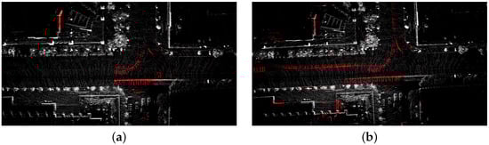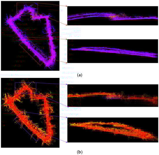 Comparison of dynamic point removal results produced by different removal methods. Dynamic objects are represented by red dots, and it is better if there are more red points. (a) Dynamic point removal results by removal method based on spatial dimension. (b) Dynamic point removal results by removal method based on spatial and temporal dimension.