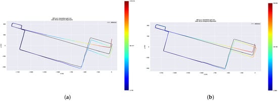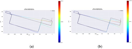 After the trajectories of these four systems are aligned with the ground truth, we acquire the error maps for these approaches. These are illustrated in Figure 13, from which we can see that the error of each position calculated by our system is less than 1.10 m, while the error of Faster-LIO, FAST-LIO and LIO-SAM can be up to 9.81 m, 9.34 m and 7.51 m, respectively.