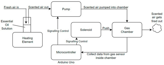 All measurements from the gas sensor were fed back to Arduino using an I2C connection. The minimum time for the solenoid to complete a full cycle of movement was found to be 200 ms. As the gas sensor’s maximum measurement frequency was one reading per second, the solenoid’s frequency was set to be larger than this. Hence the Arduino was programmed so that the gas sensor took a reading every second and the solenoid completed a cycle every two seconds. To achieve maximum efficiency of scent movement into the chamber, its volume was calculated, and it was found that it would take the pump 12 s to fully fill the air chamber. Hence the operating time for the pump was set on a cycle of 24 s, with the first 12 s on and the other 12 s off.