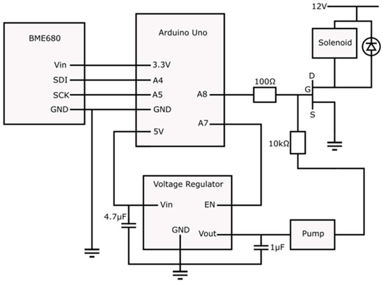 A control unit was used to drive the three electrical components, the pump to move scent into the chamber, a solenoid to actuate the membrane and a Bosch BME680 gas sensor. These components were controlled by an Arduino Uno (Arduino, Uno, Turin, Italy) board. A voltage regulator (MCP1826, Microchip, Chandler, AZ, USA) was used in the circuit to drive the pump. A 12 V DC power supply (EP-907, Manson, Beijing, China) was used as a power source. The circuit schematic of the control board is shown in Figure 3.