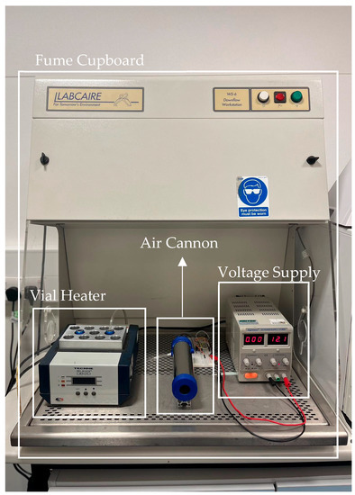 From the preliminary tests, described in Section 2.1, a final vortex canon was constructed. Steel was chosen as the main material as it is strong, durable and would reduce the amount of aroma adhering to the inside of the unit. The length was chosen to be 20 cm and the diameter of the tube was 5 cm based on the results from the preliminary experiments. From the projection side of the unit, a 3D-printed cap was constructed in PLA with different apertures. The membrane was secured at the end of the air chamber using a thin layer of nitrile (VMR, Avantor, Lutterworth, UK) with a thickness of approximately 0.12 mm. A 3D printed plastic plate, with a diameter of 18 mm, was secured in the middle of the membrane to minimise damage of the membrane by the solenoid. A testing rig was constructed to adjust the distance between the projection chamber and the other components, as shown in Figure 2a. A schematic of the device is shown in Figure 2b. The front and the back of the device is shown in Figure 2c,d. A CAD design of the solenoid holder is shown in Figure 2f. Three apertures of different diameters were 3D printed, 11 mm, 17 mm and 23.4 mm. The range was chosen based on the aperture size established in the preliminary research. These were then tested to select the one that produced the best performance. A holder for the gas chamber and a case for the solenoid were 3D printed, which included holes for screws so that they could be fixed in place during each shot. Two holes were drilled near the back of the gas chamber facing right angles to the direction of scent travel. One was used as a gas inlet for the scent, whilst the other was used for the connections to a gas sensor placed inside the chamber. This gas sensor was used to monitor the concentration of the odour throughout the experiments.