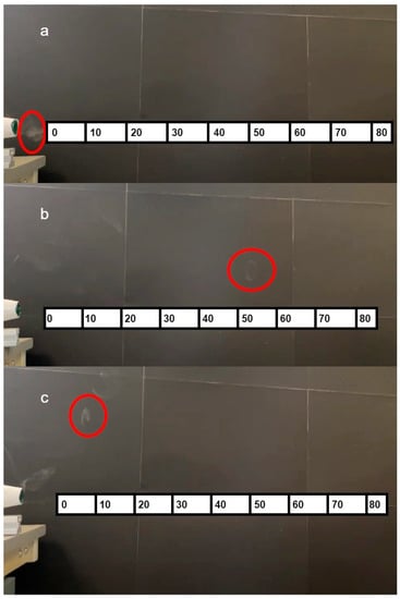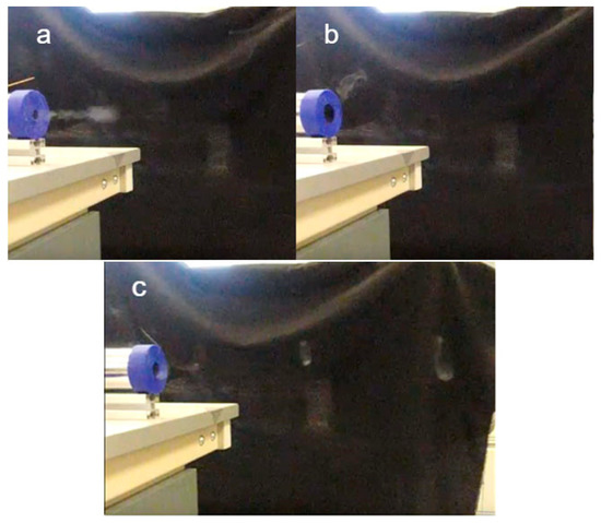 From Figure 5, the prototype with a length of 20 cm produced the best result, whereas the prototype with a length of 18.5 cm produced the worst result. This indicates that a small change in unit length strongly influenced projection distance. Figure 5c shows that for a prototype with a length of 21.5 cm, some smoke rings could be formed, but the maximum distance travelled was low. Though this cannot be seen very clearly in Figure 5, the farthest distance the vortex rings could travel for a 20 cm prototype was 50 cm, whereas, for the 21.5 cm setting, the farthest distance was only 10 cm. These results show that implementing a prototype of length 20 cm, diameter 5 cm and aperture size 1.5 cm can produce reliable smoke rings that travel a suitable distance.